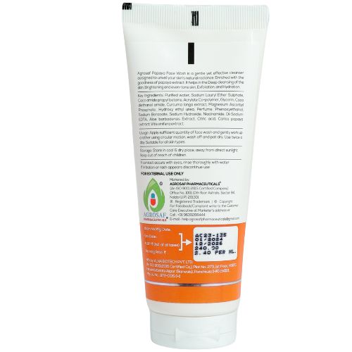 Agrosaf Papaya Face Wash is a gentle daily cleanser enriched with papaya extract to help cleanse, refresh, and support naturally glowing skin. Its skin-friendly formula removes dirt and excess oil while keeping the skin soft, hydrated, and refreshed.