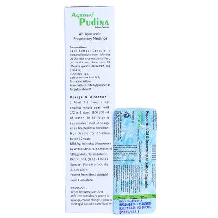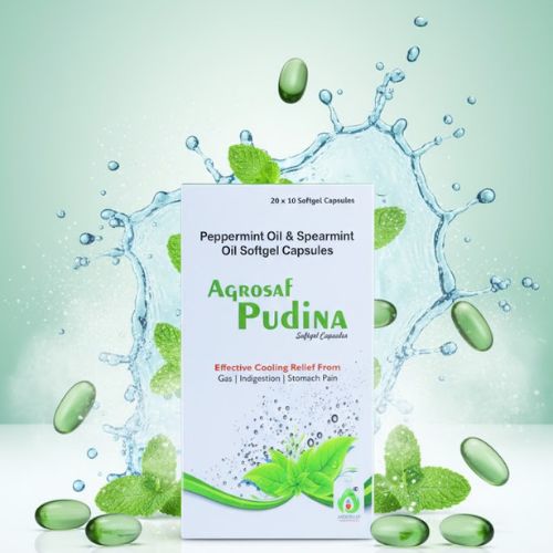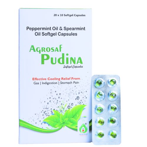 Agrosaf Pudina Softgel Capsules are formulated with peppermint and spearmint oils to support everyday digestive comfort. These easy-to-swallow softgels provide a refreshing, cooling effect that helps maintain digestive ease as part of a balanced lifestyle.