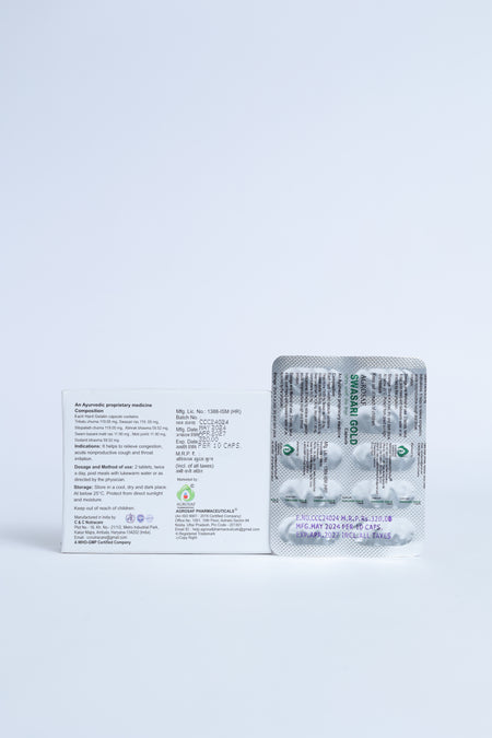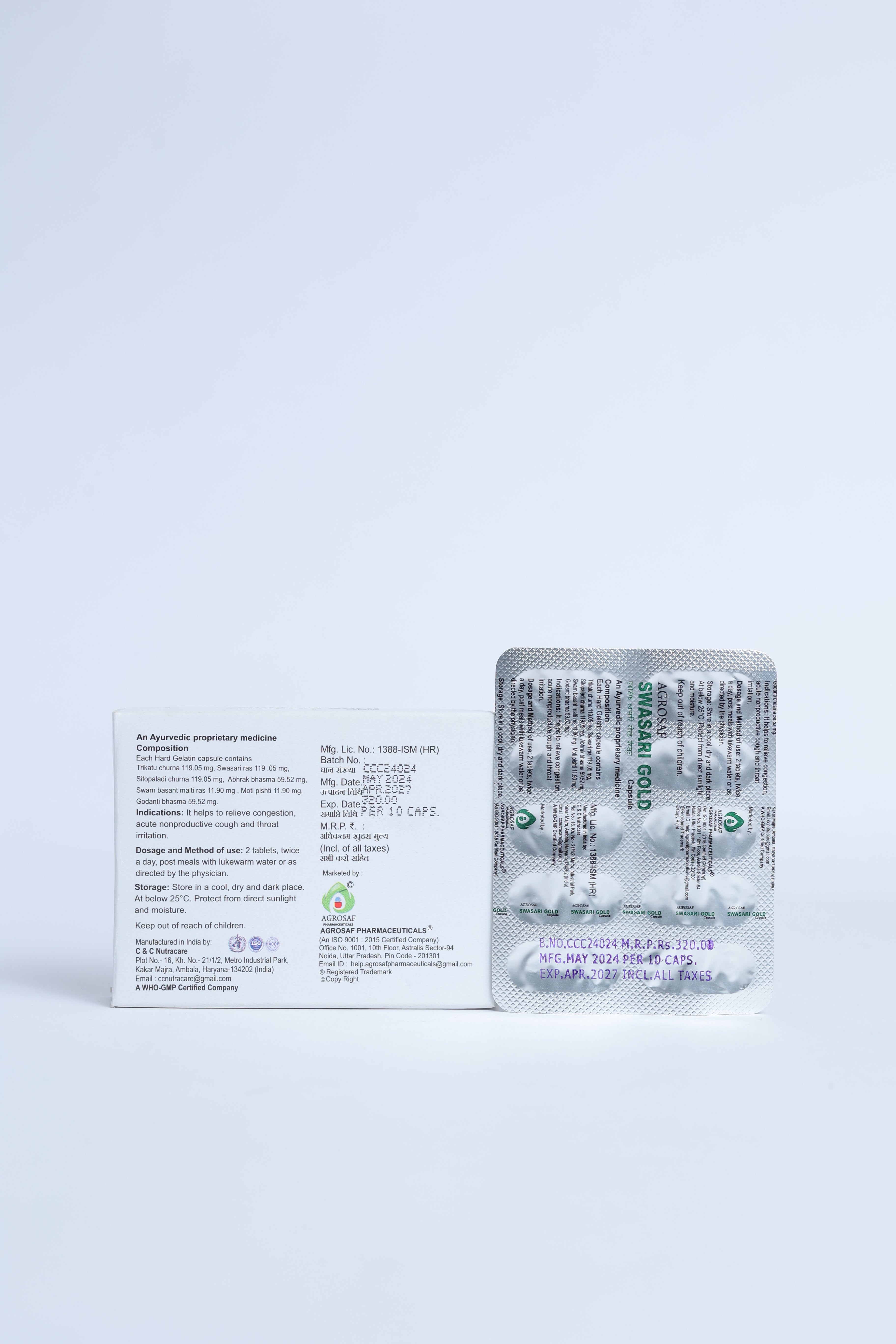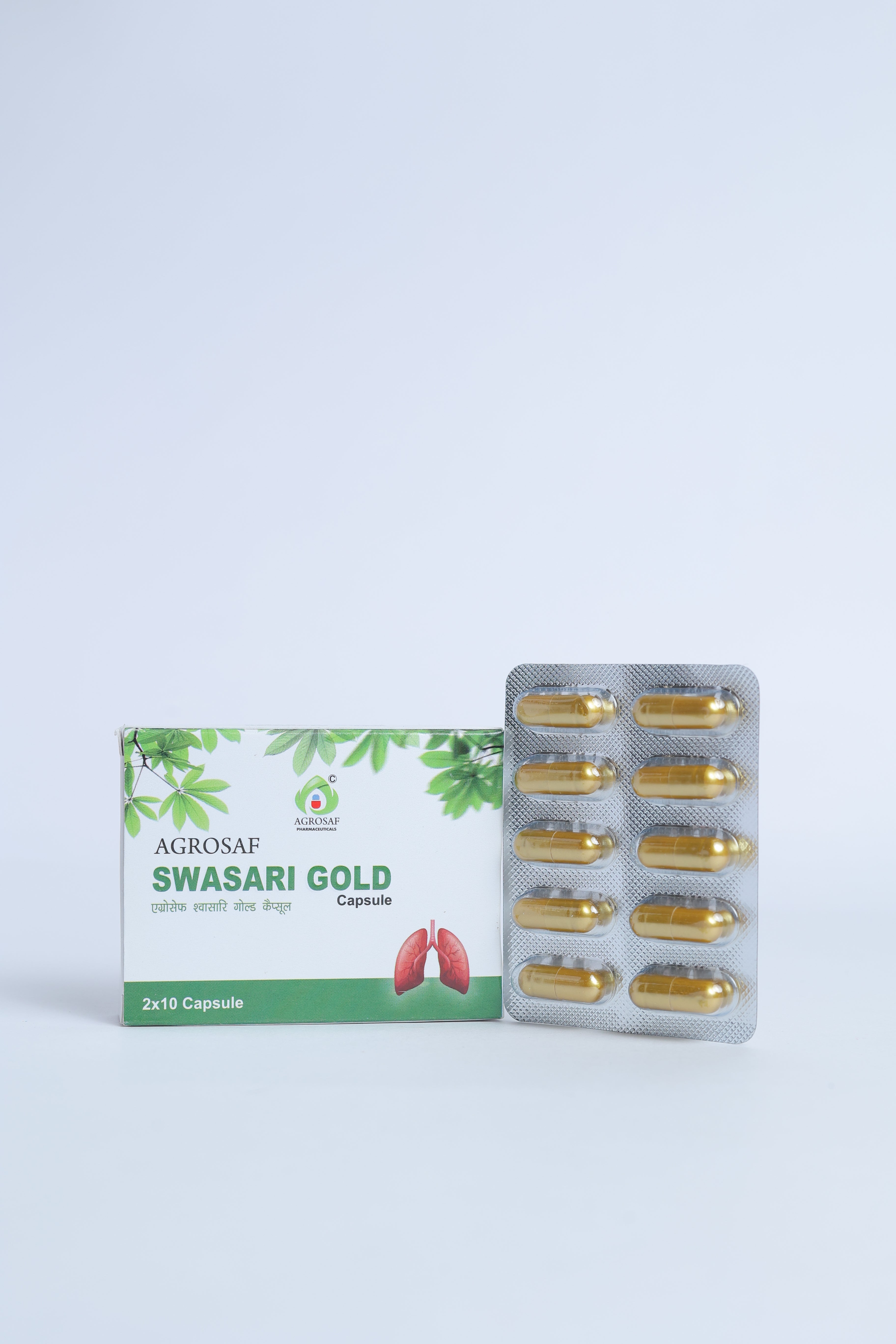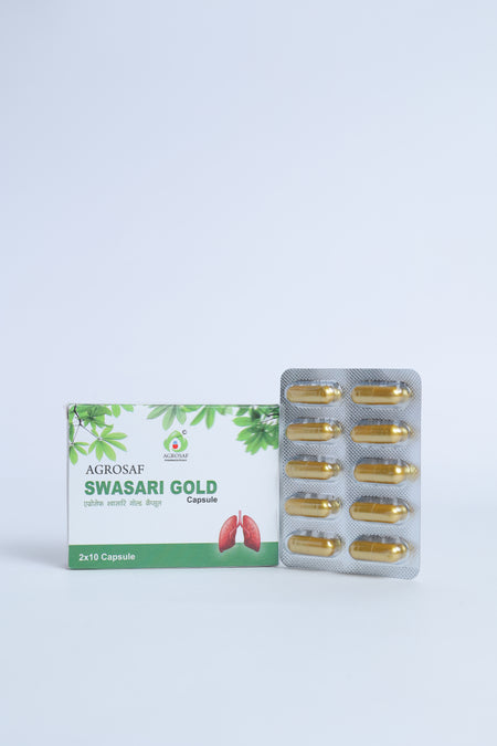 Agrosaf Swasari Gold Capsule is an Ayurvedic wellness formulation designed to support respiratory health and lung function. Prepared with time-tested herbs, it helps maintain clear breathing, supports lung comfort, and promotes overall respiratory wellness as part of a balanced lifestyle.