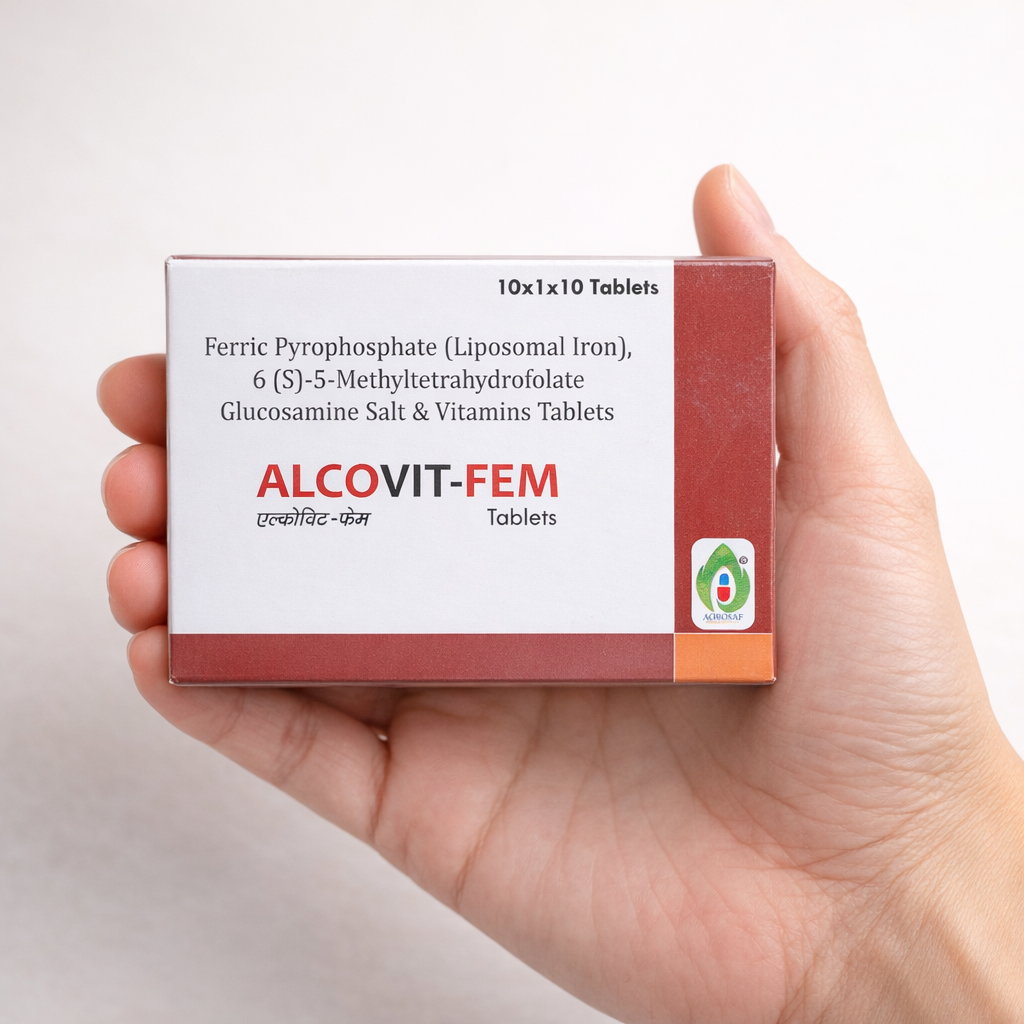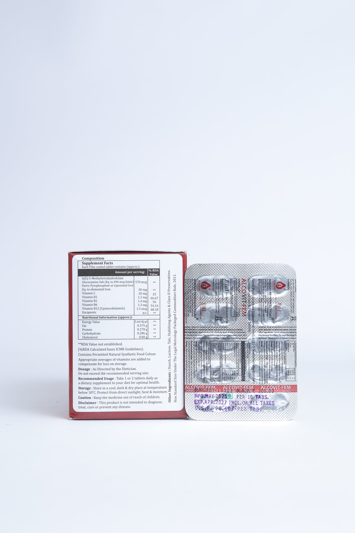 Alcovit Fem Tablet is a specialized nutritional supplement crafted to support everyday women’s wellness, iron balance and vitality. It blends active folate, bioavailable iron, vitamin C and essential B-complex vitamins for routine energy support.