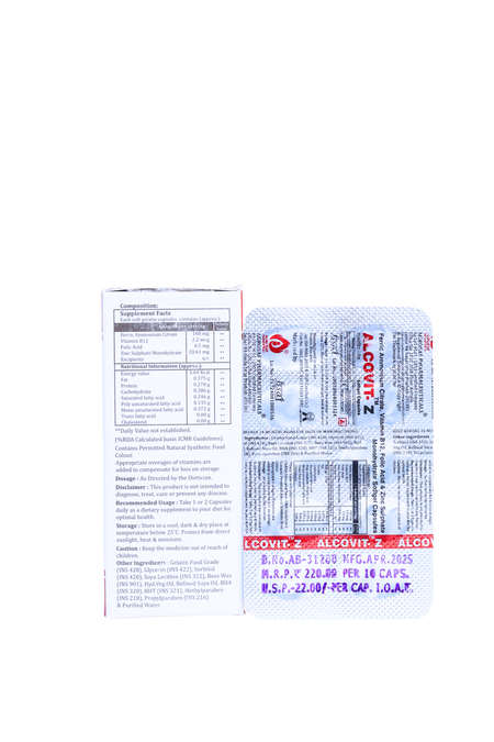Alcovit-Z Capsule is a balanced nutritional supplement formulated with iron, folic acid, vitamin B12, and zinc to support healthy blood formation and daily vitality. It helps support energy levels and immune function as part of a balanced lifestyle.