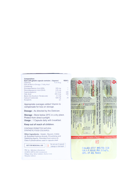 Alosole-Max Capsule is an advanced nutritional supplement formulated to support bone strength, joint health, and overall metabolic balance. Its combination of calcium, vitamin D3, omega-3 fatty acids, and essential micronutrients helps improve calcium utilization and supports musculoskeletal and cardiovascular wellness.