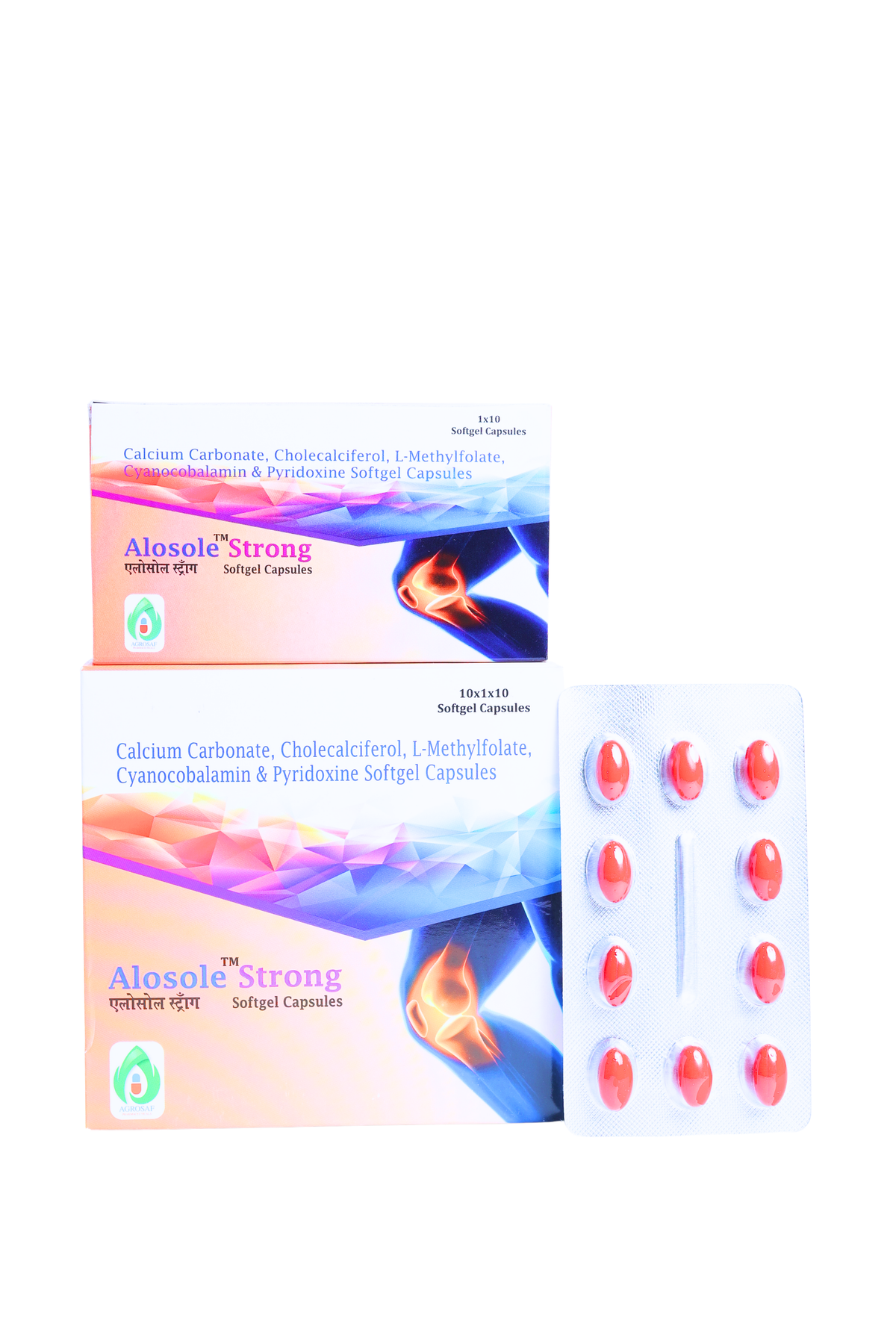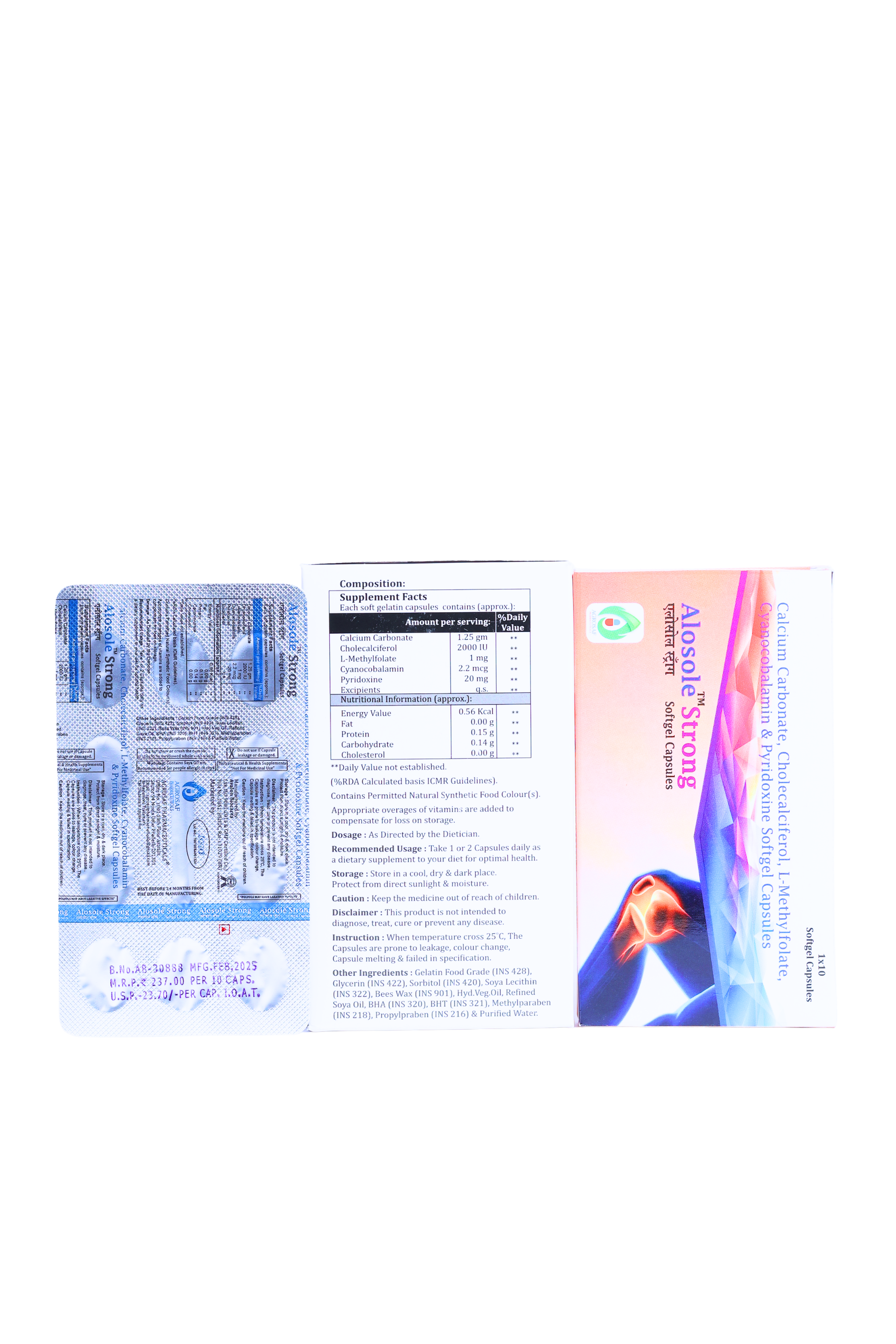 ALOSOLE STRONG Capsule is a comprehensive bone and nerve health supplement formulated to support skeletal strength, calcium absorption, and healthy nerve function. Its balanced blend of calcium, vitamin D3, and active B-vitamins supports everyday musculoskeletal and metabolic wellness.