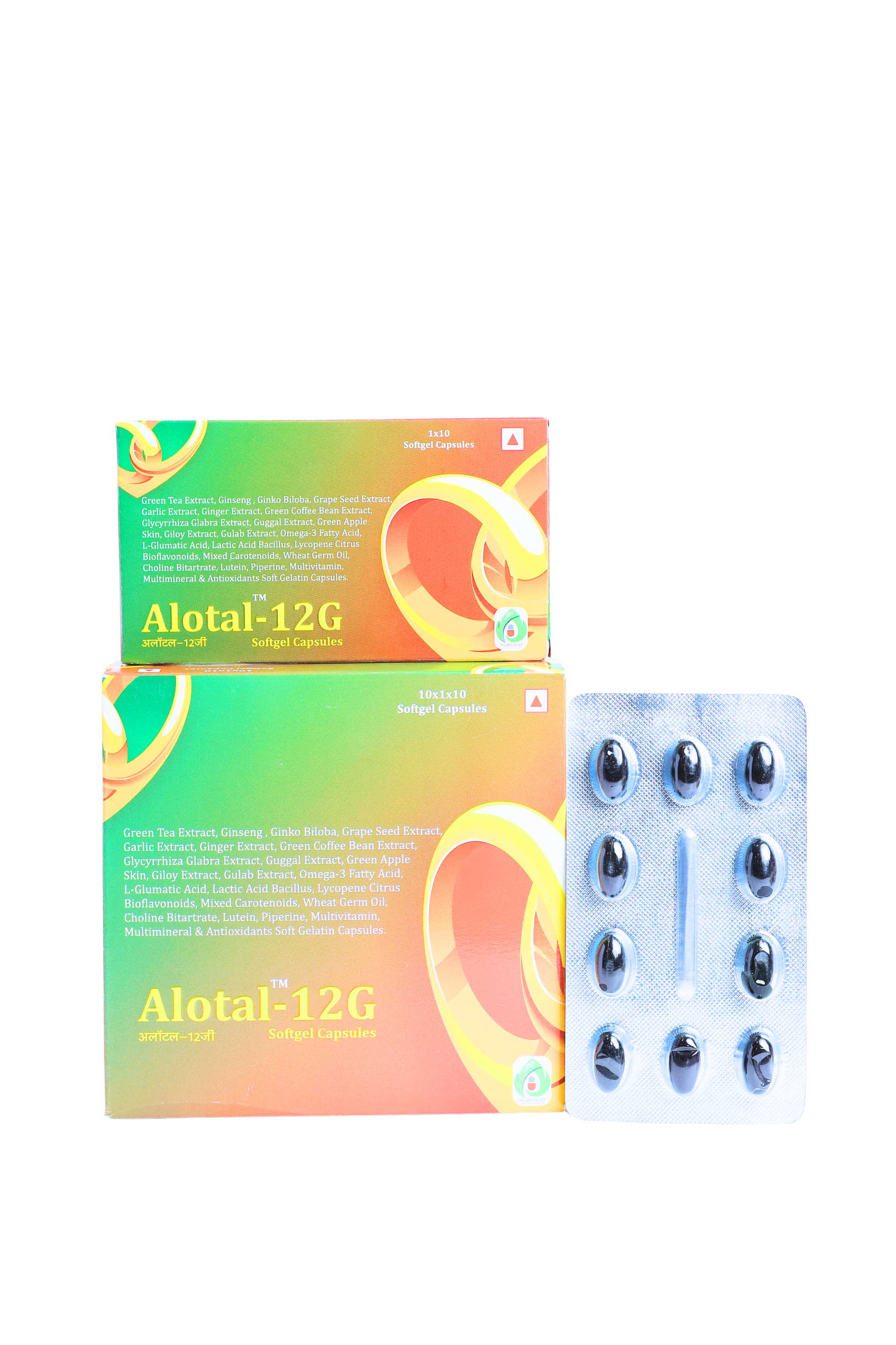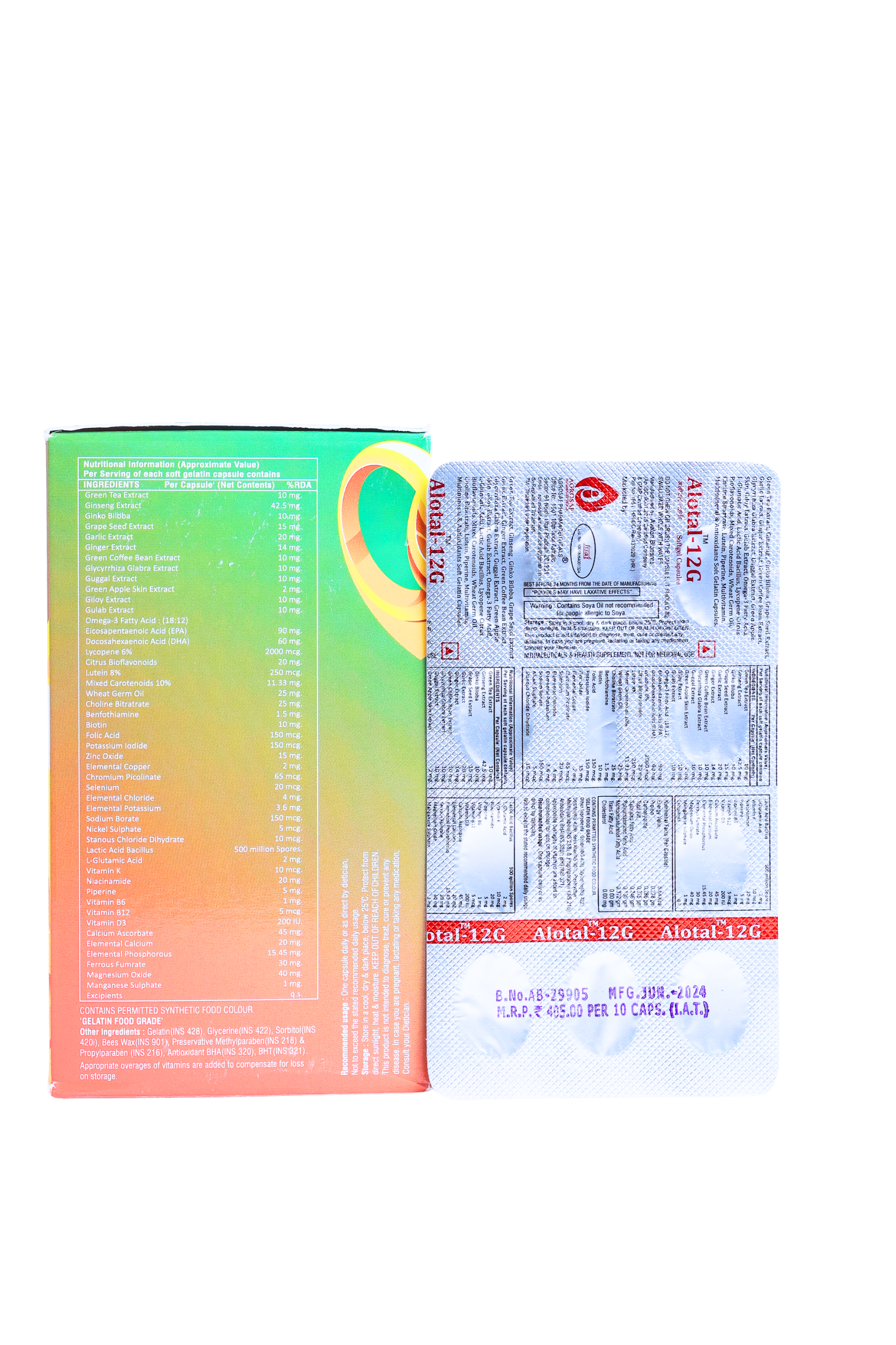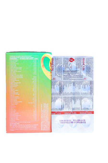 Alotal-12G Capsule is a comprehensive herbal and nutritional supplement formulated to support everyday wellness, immunity, and metabolic balance. Its blend of antioxidants, omega fatty acids, probiotics, vitamins, minerals, and herbal extracts helps promote vitality and overall wellbeing.