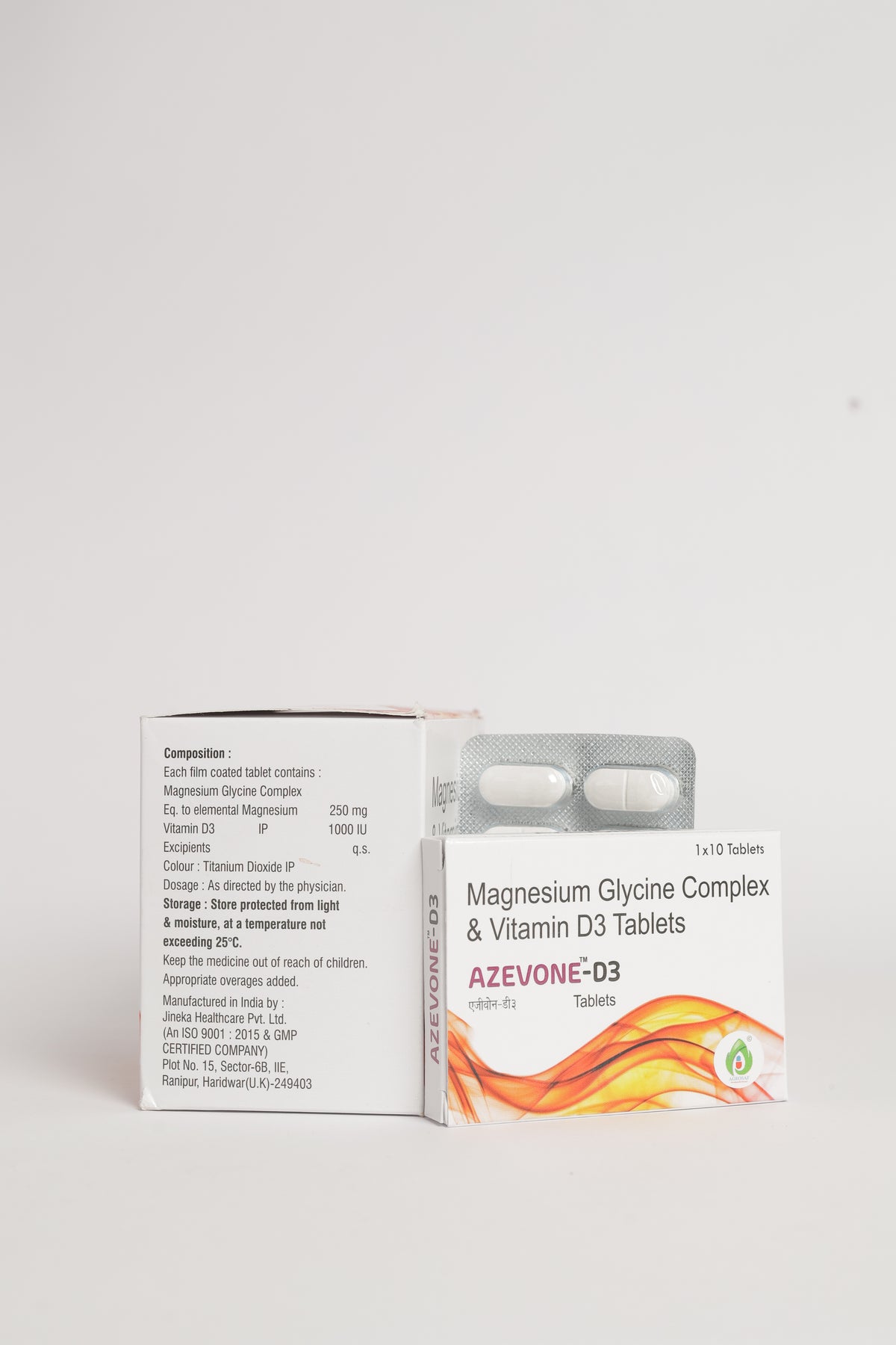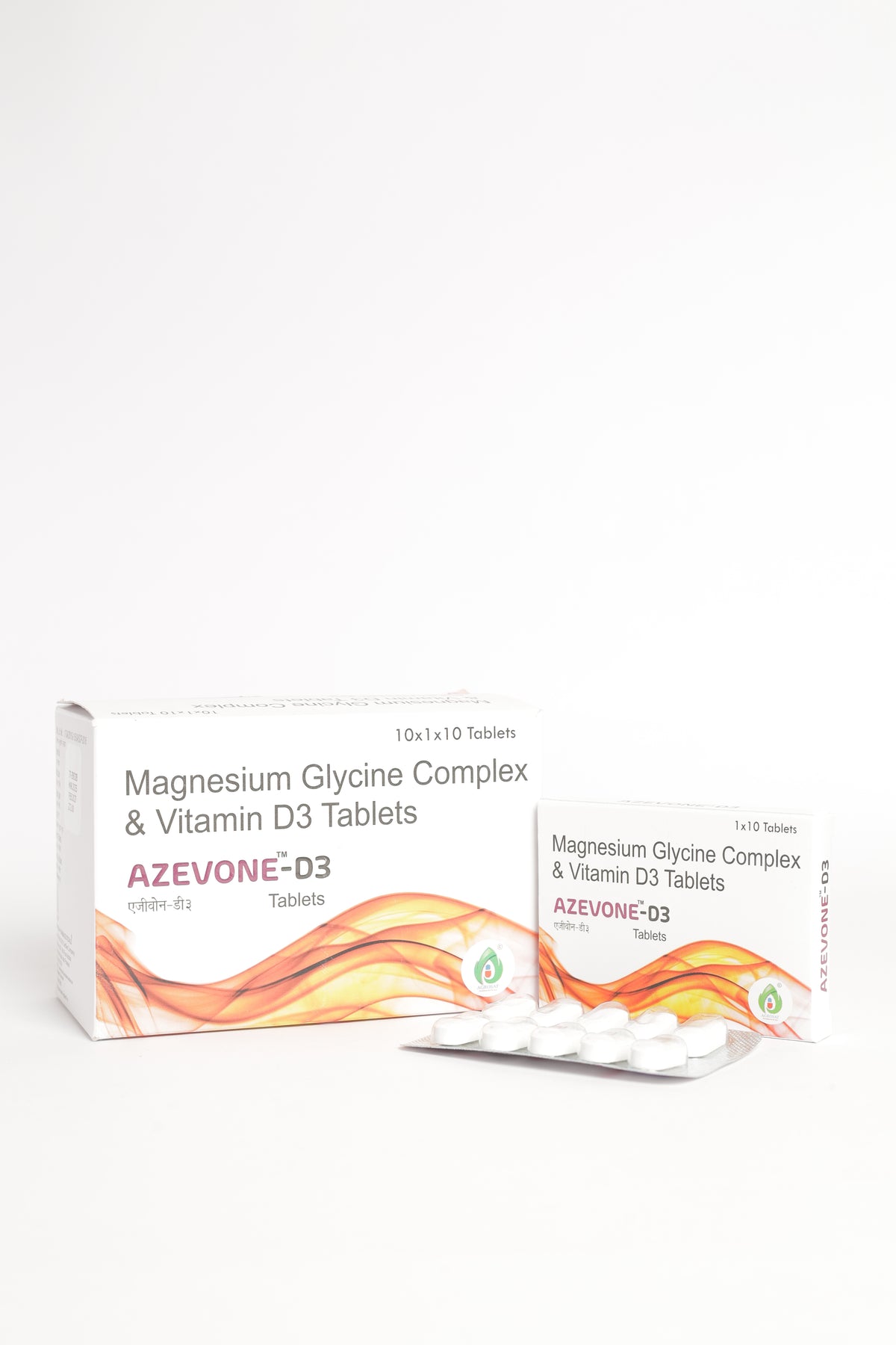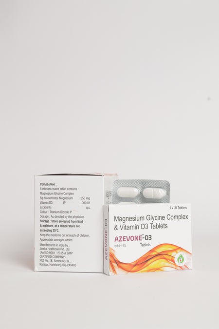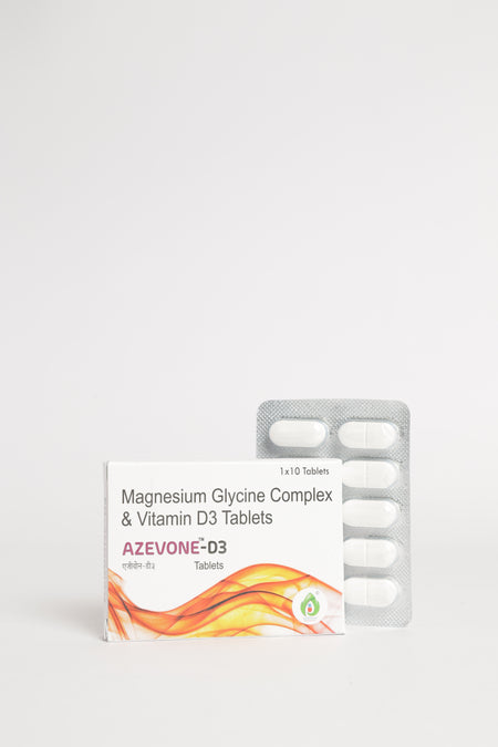 Azevone-D3 Tablet is a premium nutritional supplement formulated with highly bioavailable magnesium glycinate and Vitamin D3. It supports everyday bone strength, muscle function, and mineral balance as part of an active, balanced lifestyle.