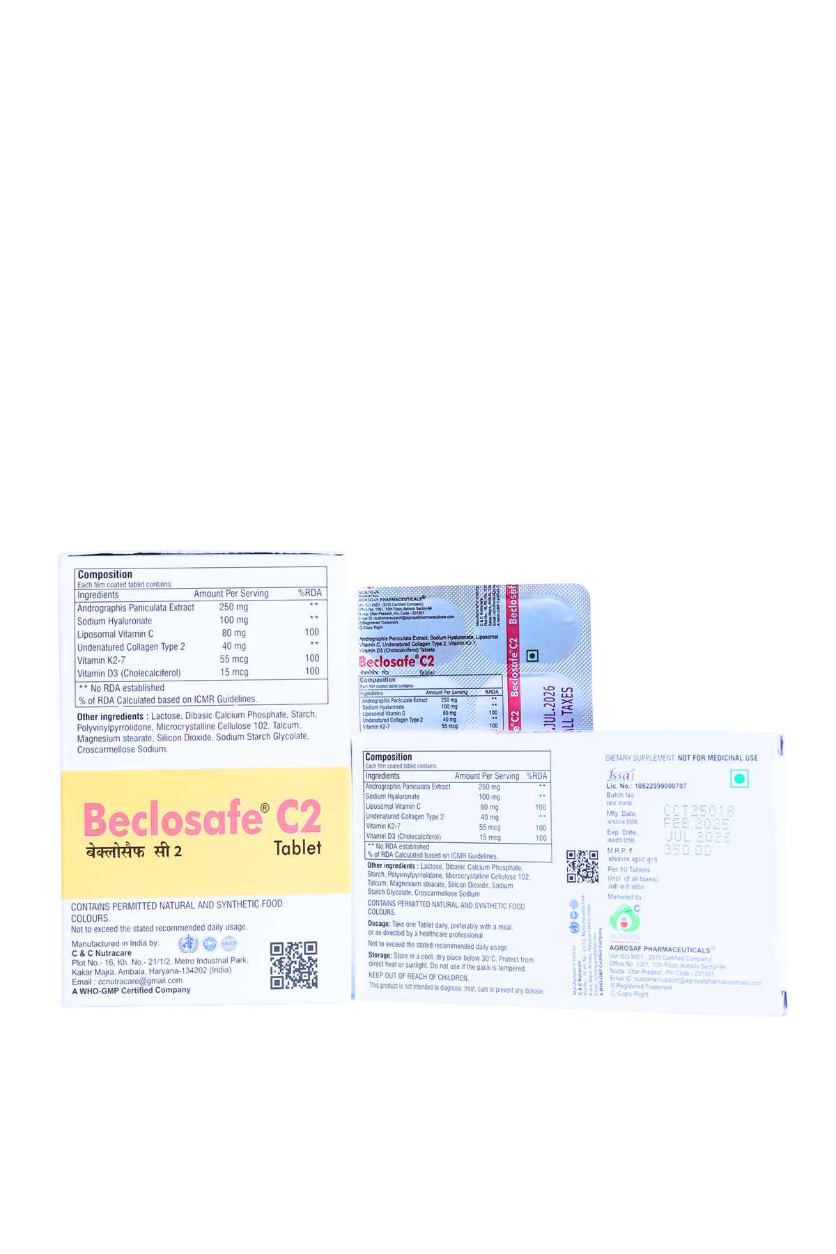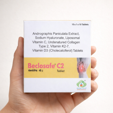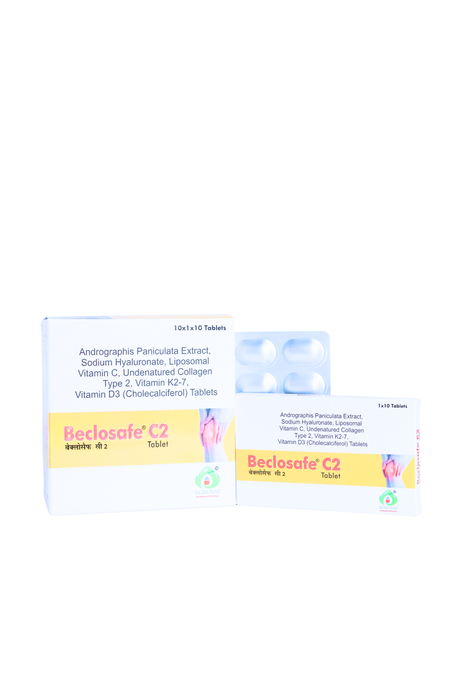 Beclosafe C2 Tablet is an advanced wellness formulation crafted to support everyday joint flexibility, bone strength and connective tissue integrity. It combines herbal extracts, collagen, vitamins and hyaluronic acid for complete musculoskeletal support.