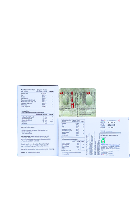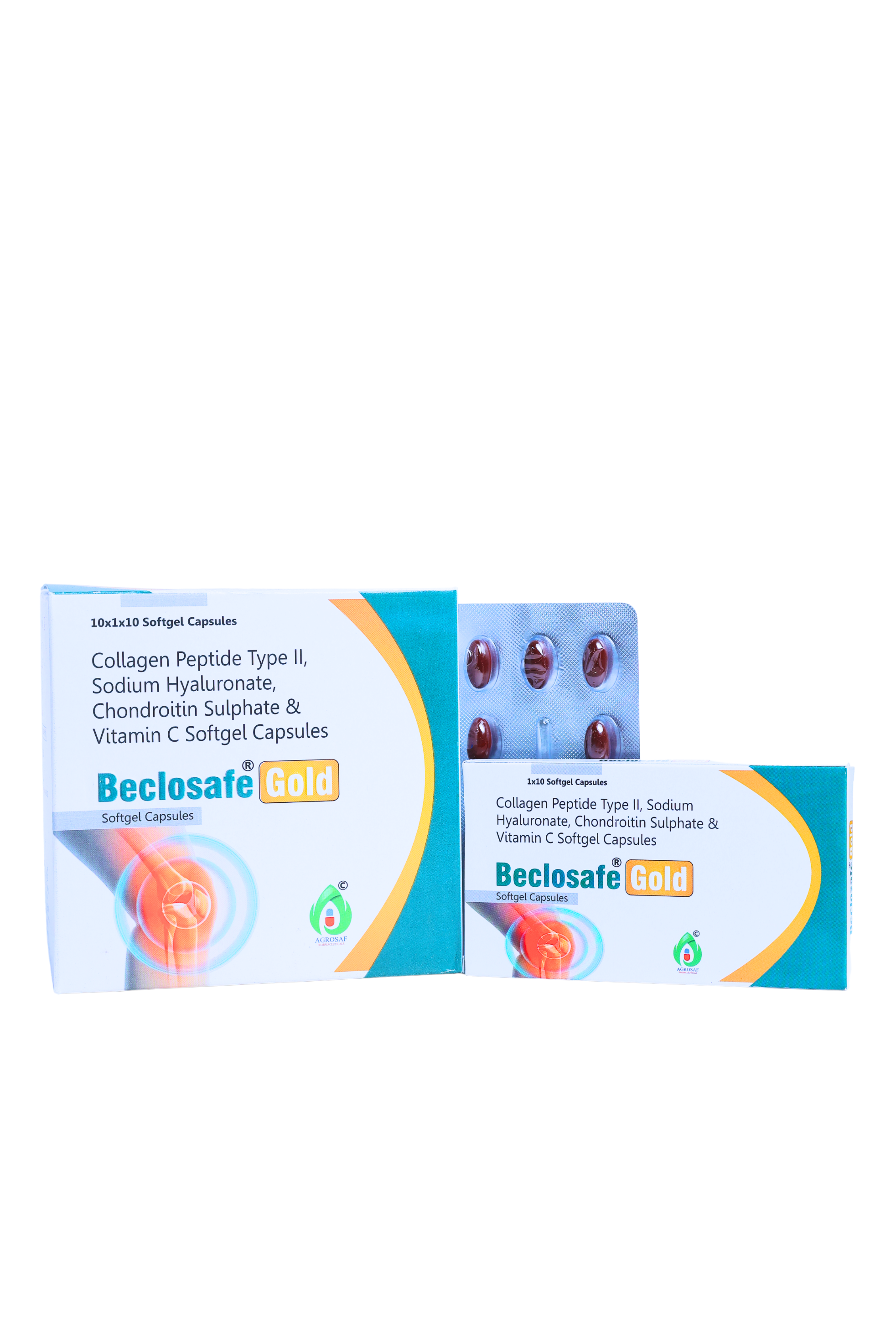 BECLOSAFE GOLD Capsule is a comprehensive joint health supplement formulated to support cartilage strength, joint flexibility, and everyday mobility. Its advanced combination of collagen peptides, hyaluronic acid, chondroitin, and Vitamin C supports long-term joint comfort as part of an active lifestyle.