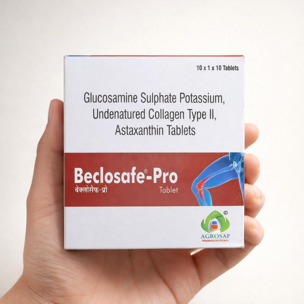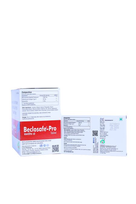 Beclosafe Pro Tablet is an advanced joint-support formulation crafted to support everyday joint strength, flexibility and mobility. It blends glucosamine, undenatured collagen and astaxanthin for complete joint wellness.