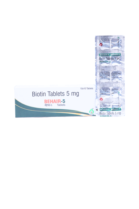BeHair-5 Tablet is a biotin-based nutritional supplement crafted to support everyday hair strength, skin wellness and nail health. It provides a convenient daily dose of biotin for routine beauty nutrition.