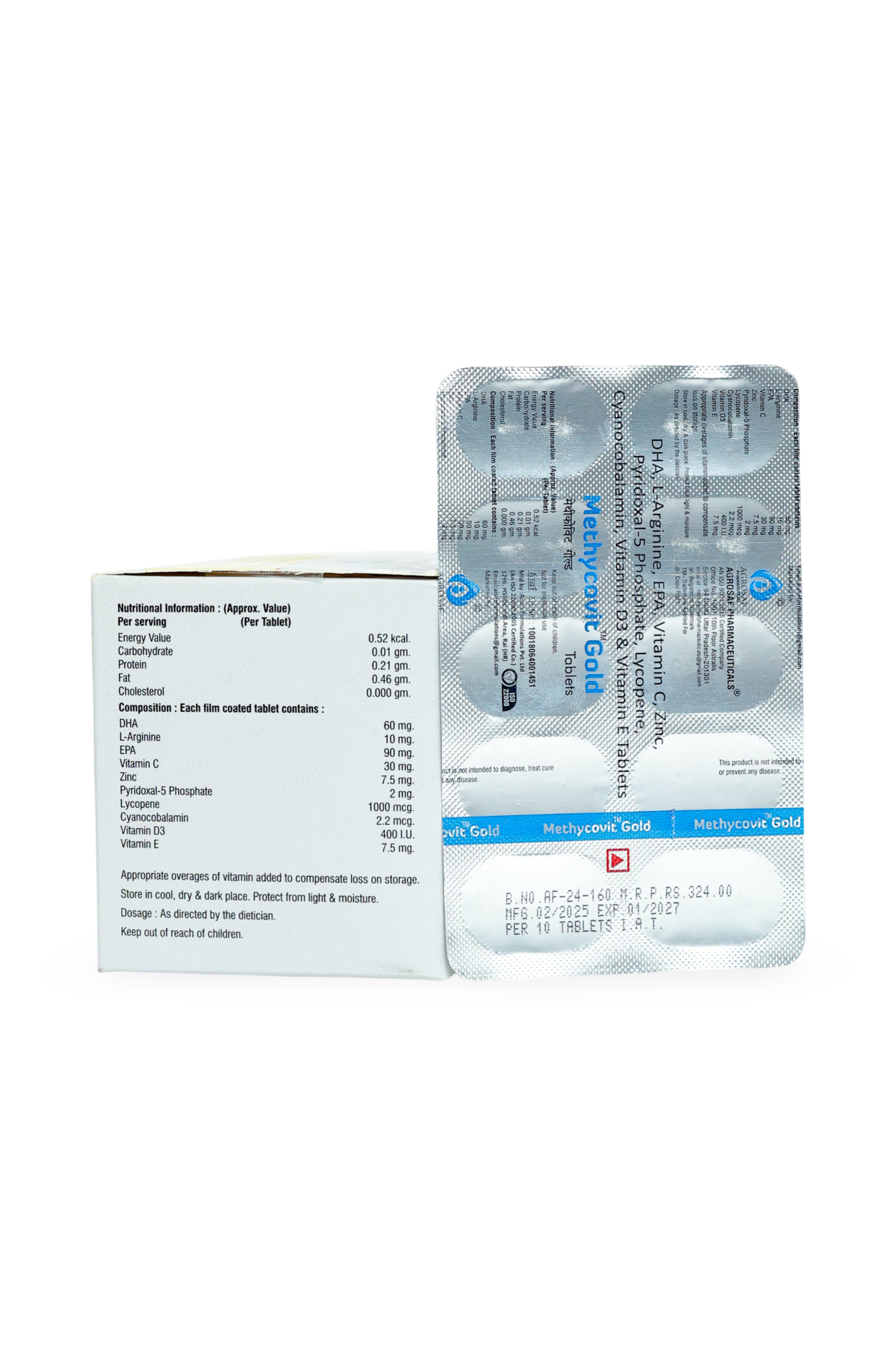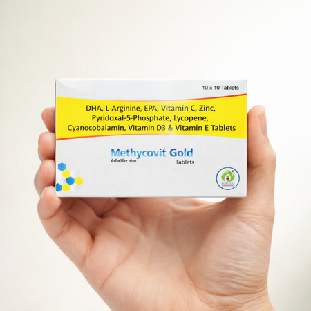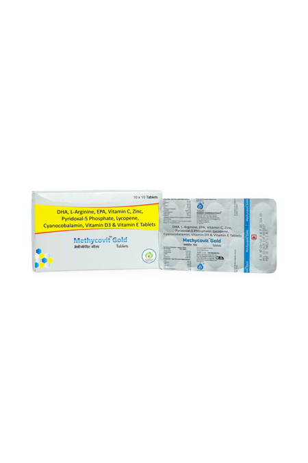 Methycovit Gold Tablet is a comprehensive multivitamin and antioxidant formulation crafted to support everyday nerve wellness, brain function and overall vitality. It blends essential vitamins, omega fatty acids and antioxidants for routine nutritional balance.