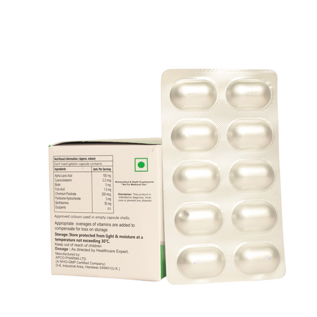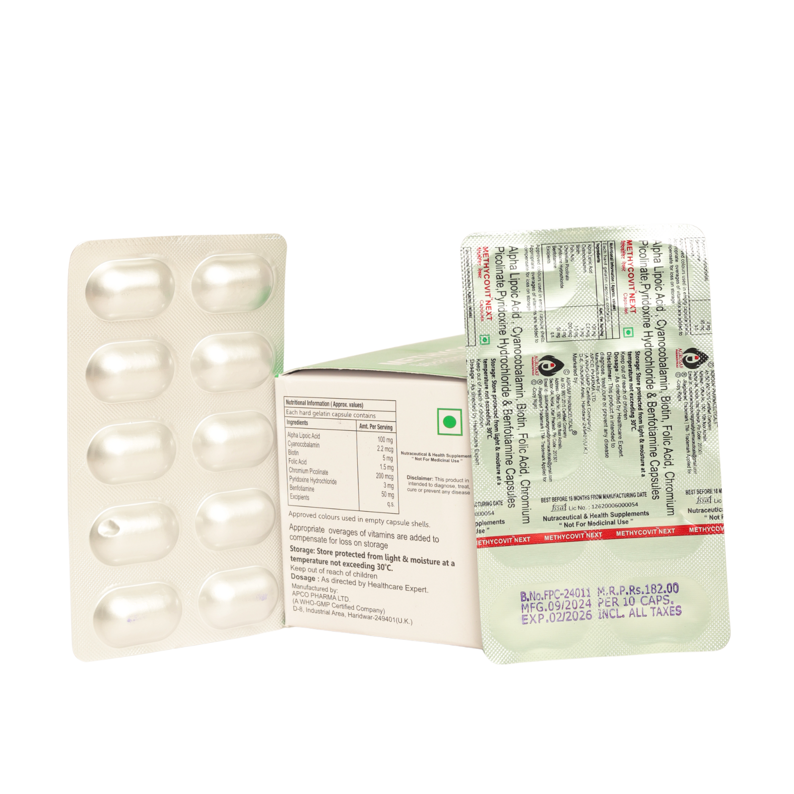 Methycovit Next Capsule is an advanced vitamin and mineral supplement crafted to support everyday nerve wellness, energy metabolism and nutritional balance. It blends active B-vitamins with biotin and chromium for routine vitality support.