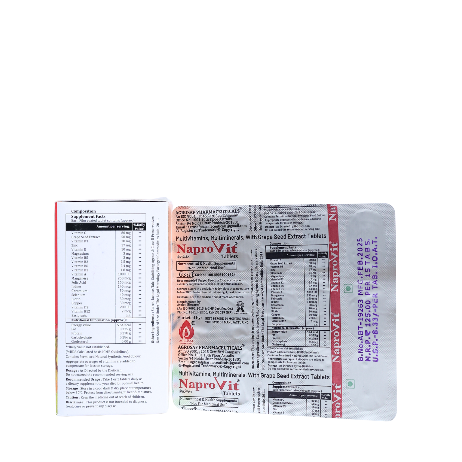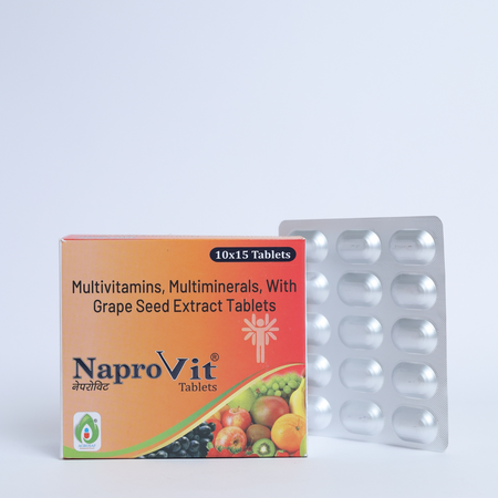 Naprovit Tablet is a comprehensive multivitamin and multimineral supplement enriched with grape seed extract to support everyday nutritional needs. It helps maintain energy, immunity, and overall wellness as part of a balanced lifestyle.