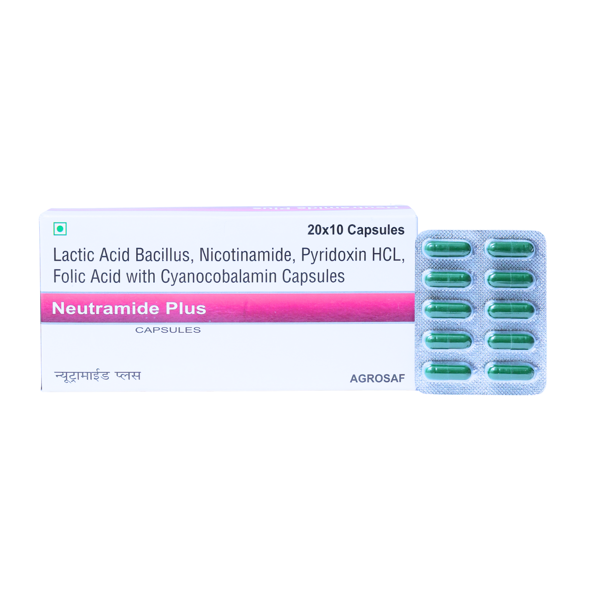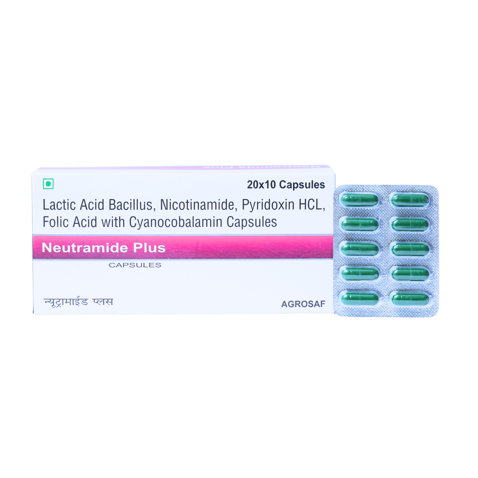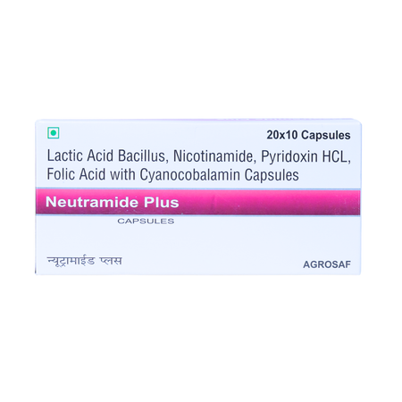 Neutramide Plus Capsule is a balanced probiotic and vitamin formulation crafted to support everyday digestive balance, nerve wellness and metabolic health. It blends beneficial bacteria with essential B-complex vitamins for routine vitality support.