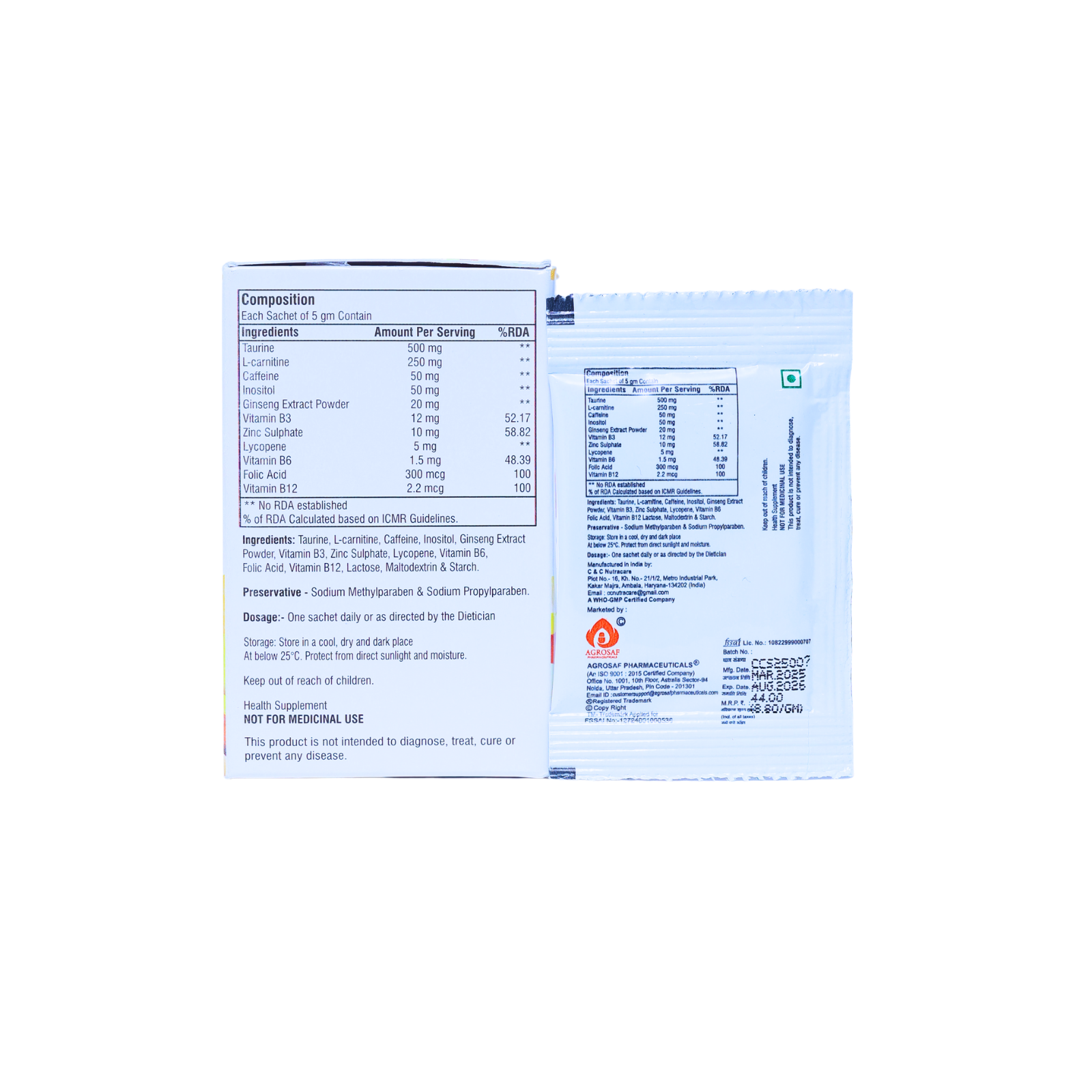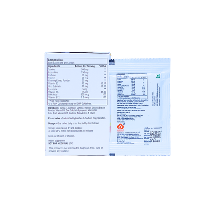 Taurine, L-Carnitine, Caffeine, Inositol, Ginseng Extract, Zinc, Lycopene, Vitamins B3, B6, B12, Folic Acid