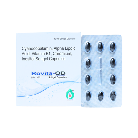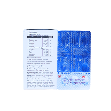 Rovita-OD Capsule is a targeted nutritional supplement formulated to support nerve health, energy metabolism, and antioxidant balance. Its combination of essential vitamins, minerals, and metabolic cofactors helps maintain overall vitality and cellular function as part of a balanced lifestyle.